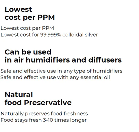 Coated Silver may be used in water to neutralize bacteria. Coated silver may also be diluted and used to brush your teeth, to gargle and to use with Neti pots. Can also be used in air humidifiers to treat and sanitize air. Coated silver may also be diluted with water to clean and sanitize surfaces.